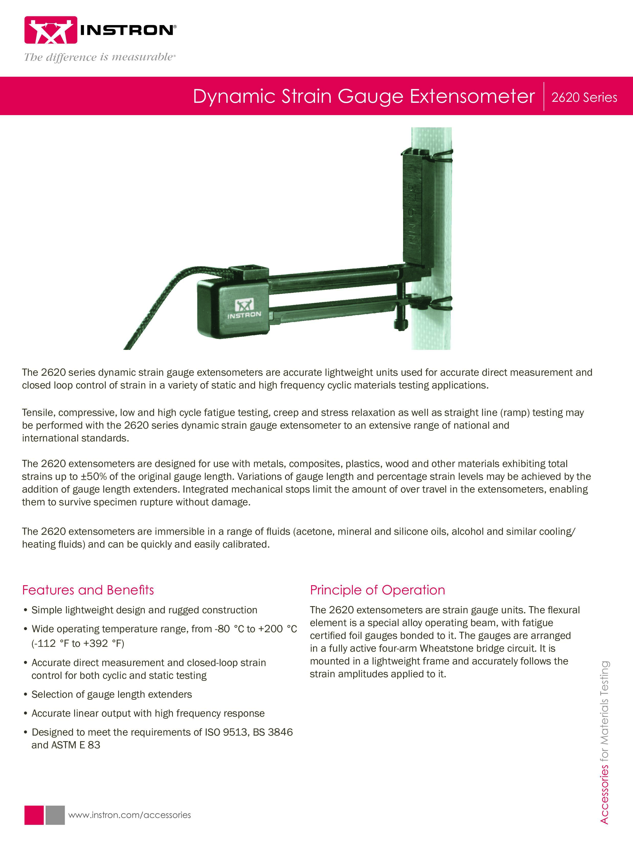 The 2630-100 series of extensometers offers speed of attachment and ease-of-use. The light-weight, rugged cross-brace design eliminates errors caused by physical distortion, while built-in protection ensures that damage is not caused by over-extension.